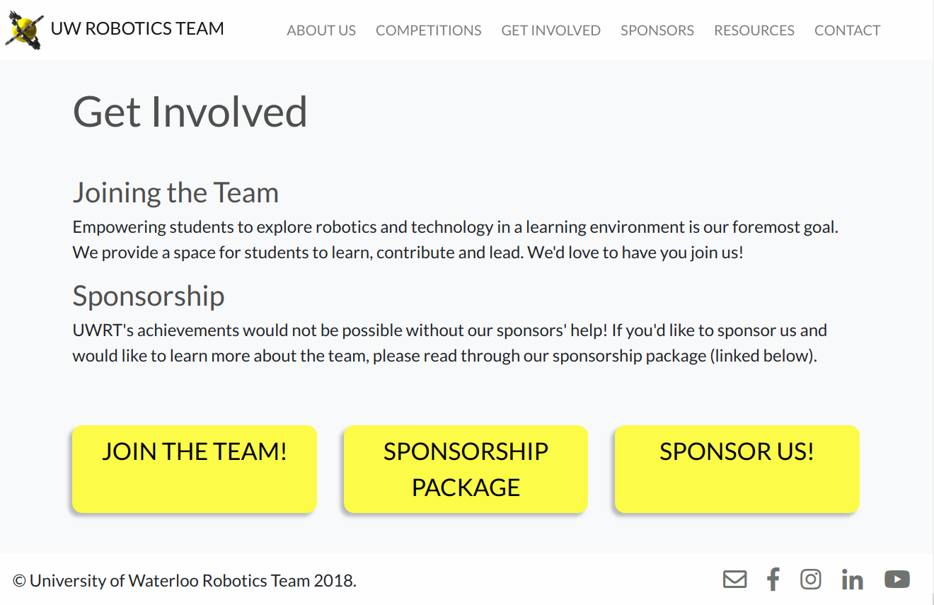 A simple site for anybody interested in learning more about the UW Robotics team. Fully responsive and designed from scratch. Showcases resources for students interested in robotics, competition info and up-to-date meeting dates.